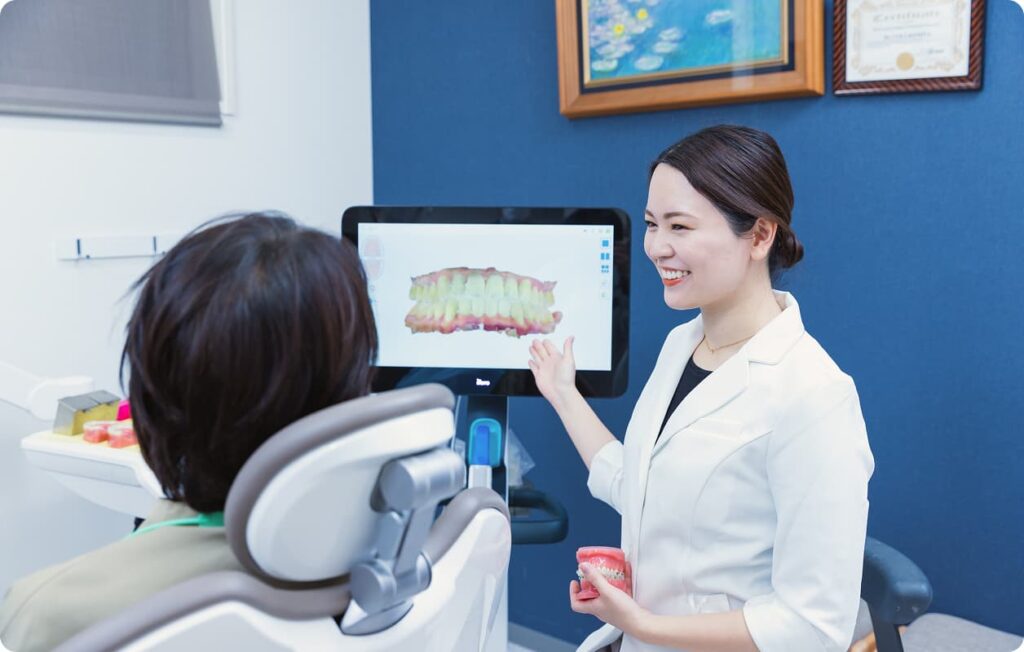 当院ではiTero(アイテロ)という最新の口腔内スキャナーを導入しています。従来の粘土のような材料を使った型取りよりも快適で、より正確な診断ができます。また、治療前後の変化をシミュレーションで確認できるので、治療を始める前に具体的な仕上がりをイメージしていただけます。「どんな風に変わるのかな?」という不安も解消できます。